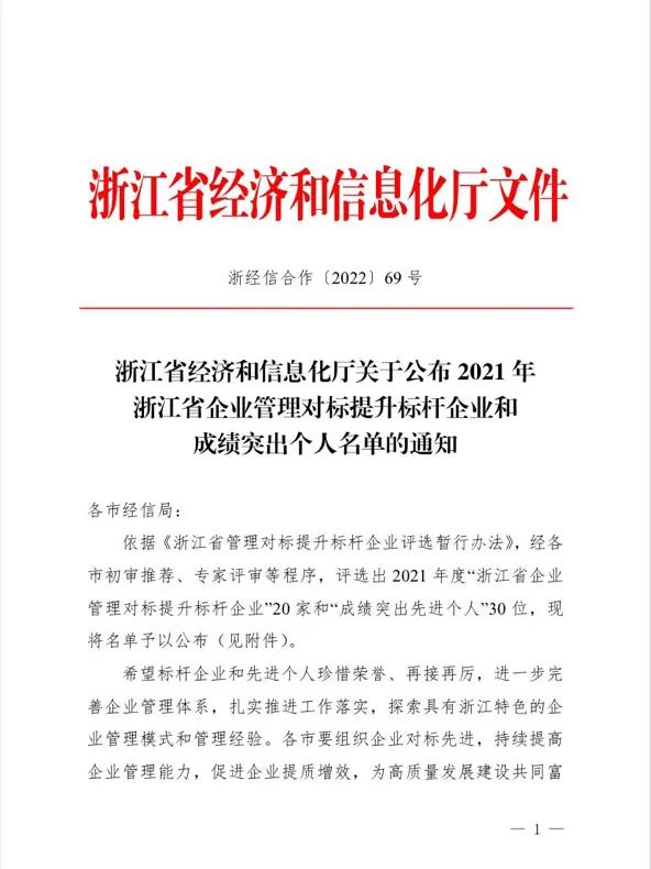 近日,浙江省经济和信息化厅公布2021年浙江省企业管理对标提升标杆企业和成绩突出个人名单。集团公司党委书记胡柏剡老师荣获“企业管理对标提升成绩突出个人”称号,这不仅是对胡柏剡老师在推进企业高质量发展方面做出突出贡献的嘉奖,也是对新和成发展成果的肯定。